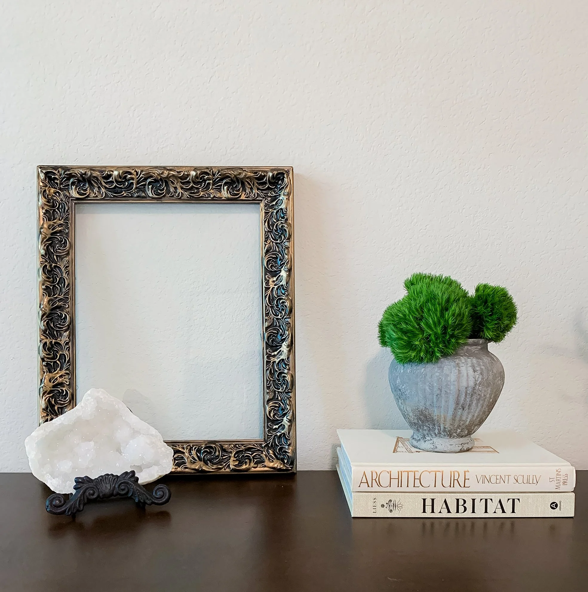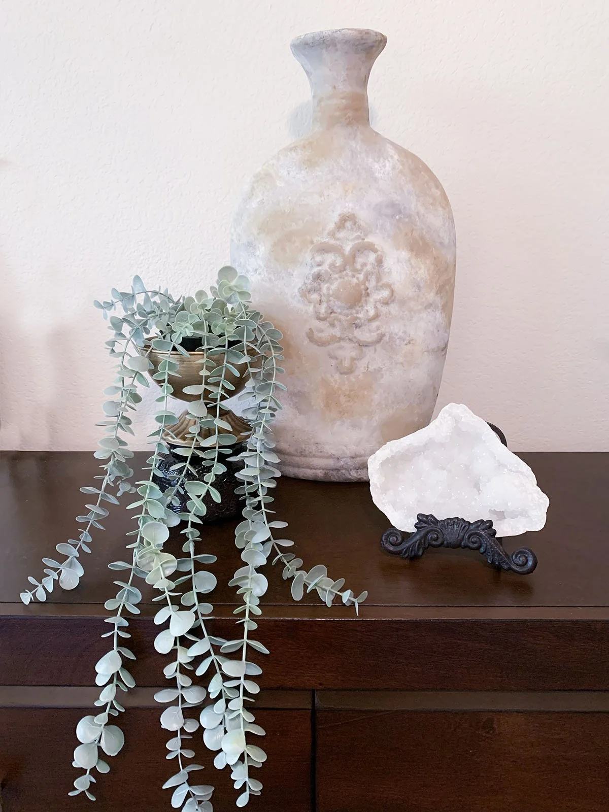 This sweet vase is a perfect container for your fresh or faux florals. I use a variety of materials to create an antique, aged finish. This particular vase has a glass base so it can hold water inside. Whether your style is vintage, organic modern, botanical or traditional, this vessel will be a beautiful addition to your space.